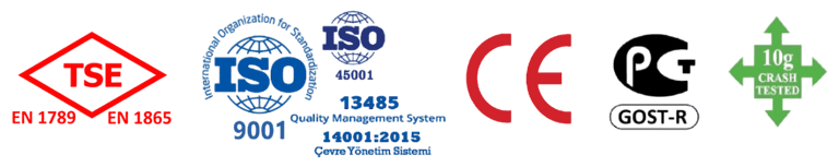 سيارة الإسعاف ذات العلامة التجارية مرسيدس مزودة بأضواء LED على السقف، وأضواء تحذيرية على الجوانب، ونظام صافرات إنذار يمكن التحكم فيه بواسطة السائق ويتميز بأنماط تشغيل متنوعة.