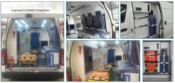 Votre véhicule d'ambulance Toyota Hiace est équipé de lumières et de signaux d'avertissement sur le toit et les côtés, ainsi que de projecteurs à l'arrière. Le système de sirène de l'ambulance Toyota Hiace, contrôlé par le conducteur, peut fonctionner en différents modes. Le compartiment pour les patients est renforcé par des poutres de support, offrant une isolation phonique et thermique. Le sol de l'ambulance Toyota Hiace est recouvert d'une base en époxy lavable, antibactérienne et antistatique. Sur le côté gauche de la cabine (selon les préférences du client), il y a un système de placards fonctionnels en MDF ou en matériau en mousse. Le côté droit de la cabine comprend un groupe de sièges pouvant être utilisé pour le stockage. Le système d'éclairage intérieur de l'ambulance Toyota Hiace se compose de néons et de projecteurs. L'ambulance Toyota Hiace est équipée d'un deuxième climatiseur, d'une batterie supplémentaire, d'un panneau de contrôle, d'un chauffage et d'un système de communication interne.