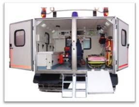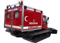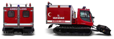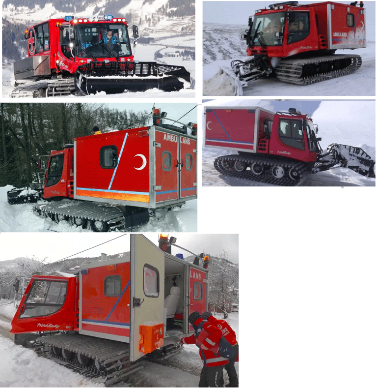 Your Pistenbully Ambulance vehicle is a self-tracked model designed to operate with high maneuverability and usability in heavy snow and challenging terrain conditions. Equipped with a snowplow at the front, the Pistenbully Ambulance enables access to any desired location on snowy surfaces. It features LED rooftop lights and LED warning lights on the sides, with a driver-controlled siren system capable of operating in various modes. The interior of the Pistenbully Ambulance is designed with an antibacterial, washable, non-slip floor covering. Sound and heat insulation is provided within the vehicle, supported by reinforcement beams. It also includes a digital electrical panel with fault notification and safety switches, an inverter, a rectifier, a secondary battery system, an independent diesel heater, an internal communication system, and an ABS ceiling structure with lighting, grab handles, and IV pole holders. The Pistenbully Ambulance provides seating for four people with storage space underneath. Additionally, there is a stretcher ramp at the rear, allowing a stretcher to be loaded by a single person. The vehicle can be customized with lettering and striping according to your preferences.