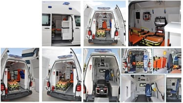 Your Volkswagen Transporter Ambulance vehicle is equipped with lighting and warning lights on the top and sides, along with rear area floodlights. The siren system of the Volkswagen Transporter Ambulance, controlled by the driver, can operate in various modes. The vehicle features an antibacterial, washable, non-slip floor covering. The patient compartment of the Volkswagen Transporter Ambulance is reinforced with support beams and provides sound and heat insulation. The left side of the patient cabin includes a functional cabinet system, while the right side features an attendant seating group that can be used for storage purposes. The front section of the cabin is equipped with a material cabinet, a doctor's seat, and an electric sink system. The ceiling of the Volkswagen Transporter Ambulance is made of PVC-coated aluminum material and includes ceiling IV poles and grab handles for personnel, along with an interior lighting system consisting of fluorescent and spotlights. The vehicle is equipped with an electrical panel and safety switches, an inverter, rectifier, and a secondary battery system. The patient cabin heating system features a water-based heater. The Volkswagen Transporter Ambulance has an internal communication system (intercom) between the driver’s cabin and the patient cabin. It also has a 220V external power input and an extension cable. The vehicle can be designed with custom lettering and striping according to your preferences.